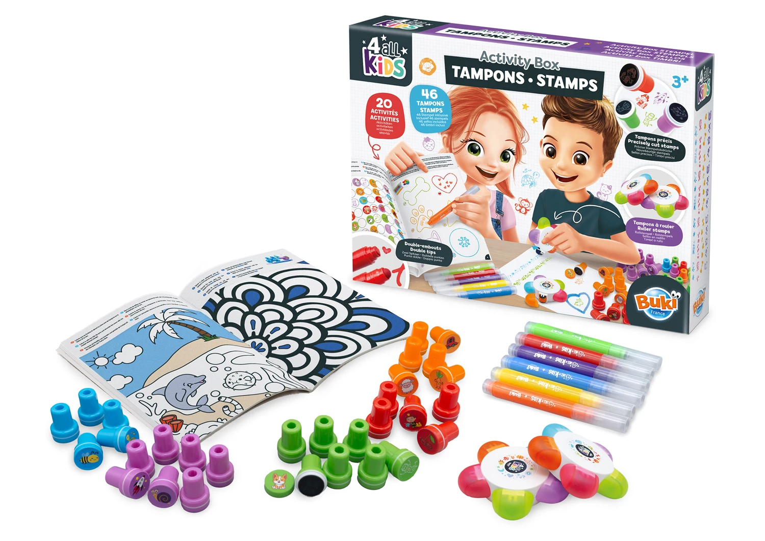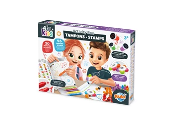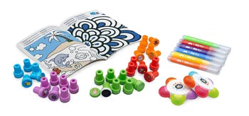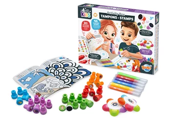 Eine Box mit 46 abwechslungsreichen und farbenfrohen Stempeln! Male das Heft mit den Markern aus und fülle die Dekorationen mit den Stempeln... Inhalt: 30 Stempel (6 orange, 6 blau, 6 grün, 6 violett, 6 rot), 2 Blumenstempel für insgesamt 10 Motivstreifen, 6 Rundstifte und Stempelspitzen. 20-seitiges farbiges Aktivitätsheft.