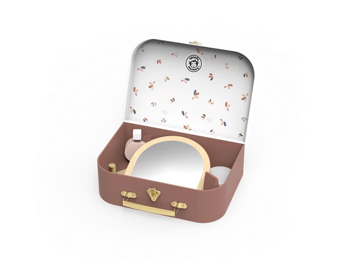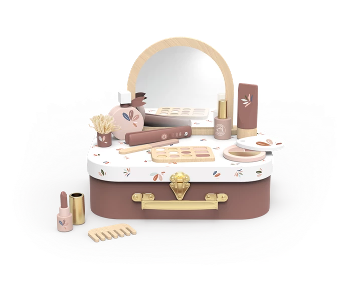 Der Beauty-Koffer ist aus FSC-zertifiziertem Holz gefertigt und mit ungiftigen, kindersicheren Lacken lackiert. Er vereint umweltfreundliche Materialien mit Langlebigkeit. Dank seines kompakten, tragbaren Designs eignet er sich ideal zum Spielen zu Hause oder auf Reisen. Der Spiegel lässt sich einfach in die Schlitze im Deckel einrasten und verleiht dem Spielerlebnis einen zusätzlichen Hauch von Realismus.