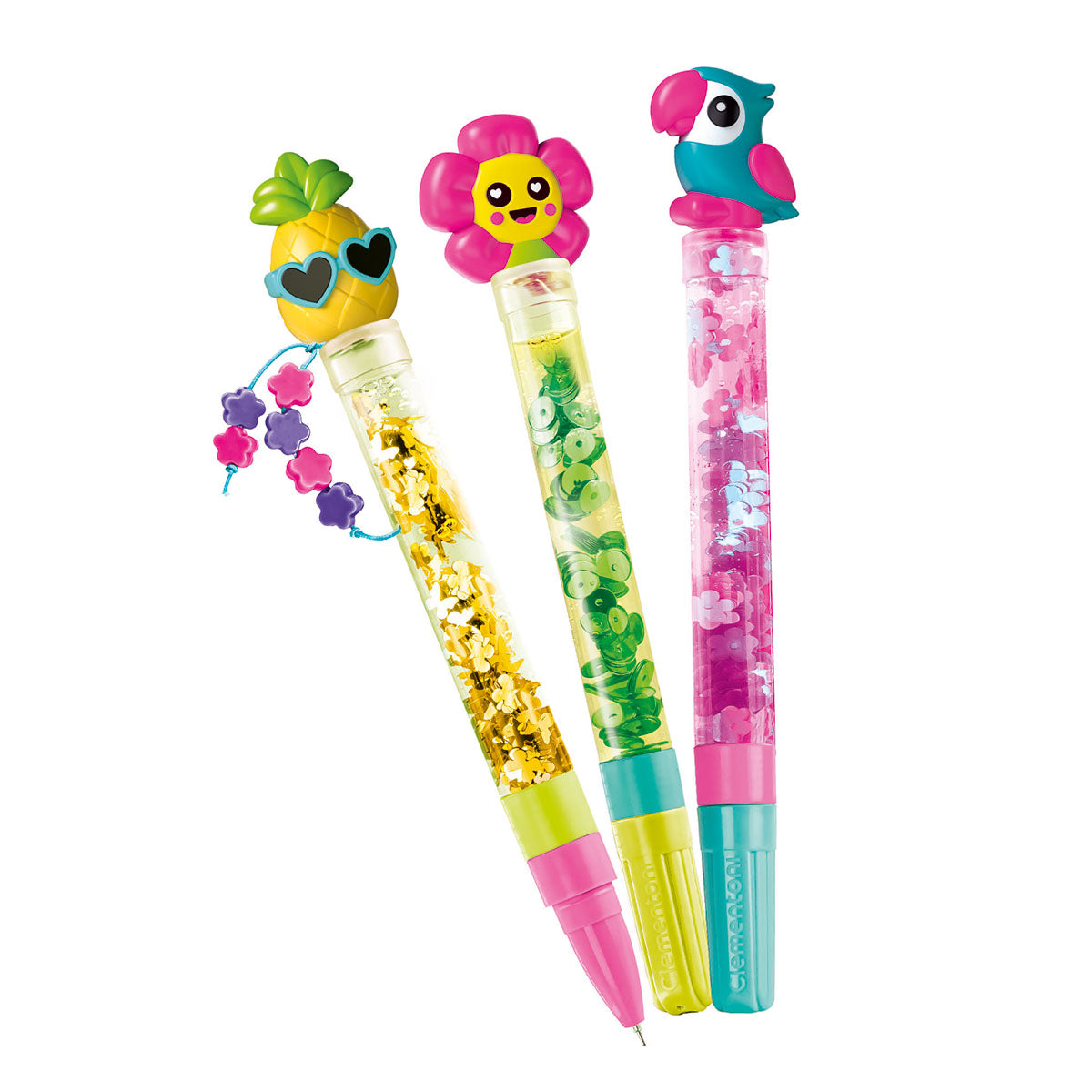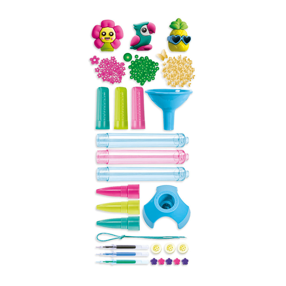 Gestalte deine eigenen Stifte – Tropical. Ein originelles Kreativset, mit dem du drei Stifte zusammenstellen und mit verschiedenen tropischen Dekorationen personalisieren kannst. Das Set enthält drei Stifte zum Zusammenstellen, drei verschiedenfarbige Tinten, drei Figuren und sämtliches Zubehör zum Dekorieren. Mit diesem Spiel kannst du deine Stifte mit vielen Accessoires und verschiedenen Dekorationen individuell gestalten.