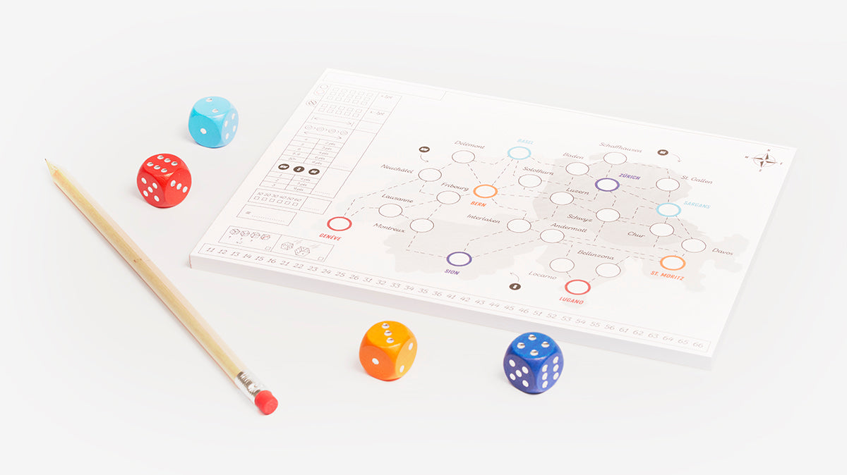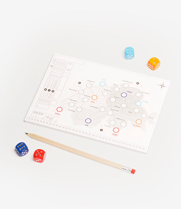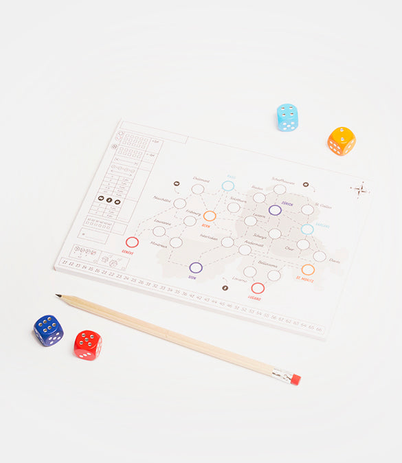50 Blatt Schweizer Landkarten, 4 Bleistifte, 4 farbige Würfel