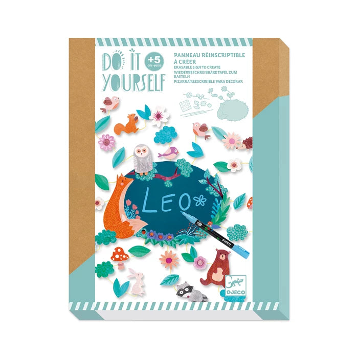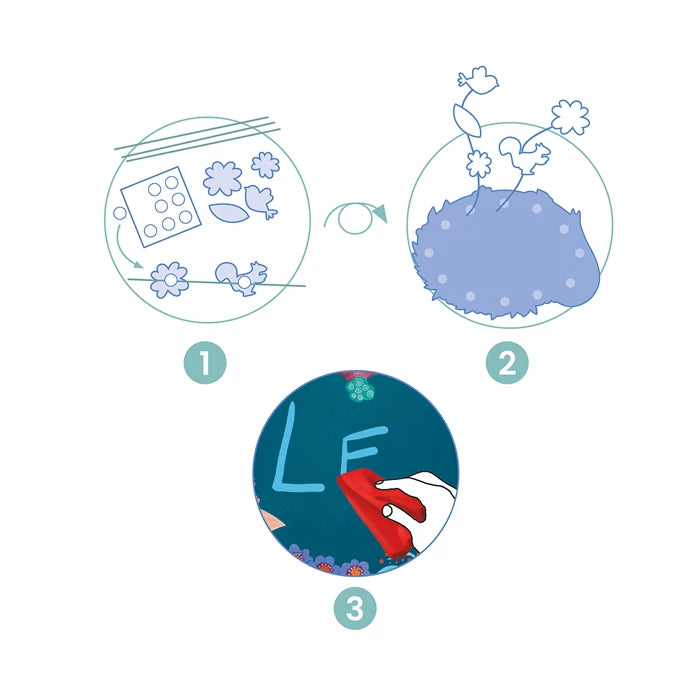 Das Kind klebt die Illustrationen mit dicken Schaumstoffaufklebern auf die halbstarren Stäbe und montiert sie dann auf der Tafel, die sich in eine schöne, wiederbeschreibbare Dekorationstafel verwandelt. Ein originelles Produkt, das die praktische Seite der löschbaren Tafel in ein schönes Dekorationsobjekt verwandelt.