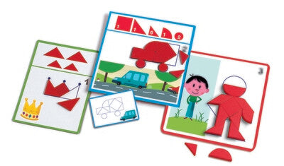 Setzen Sie die geometrischen Formen auf dem Brett zusammen und haben Sie Spaß beim Nachbauen einer der 24 Herausforderungen.