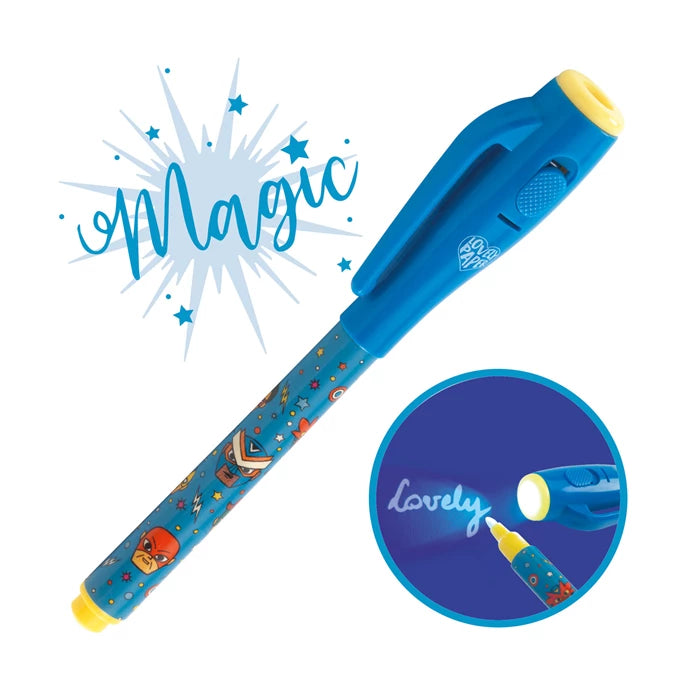 Unsichtbare Tinte, die dank der in der Kappe befindlichen UV-Lampe zum Vorschein kommt.