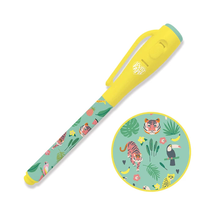 Unsichtbare Tinte, die dank der in der Kappe befindlichen UV-Lampe zum Vorschein kommt.