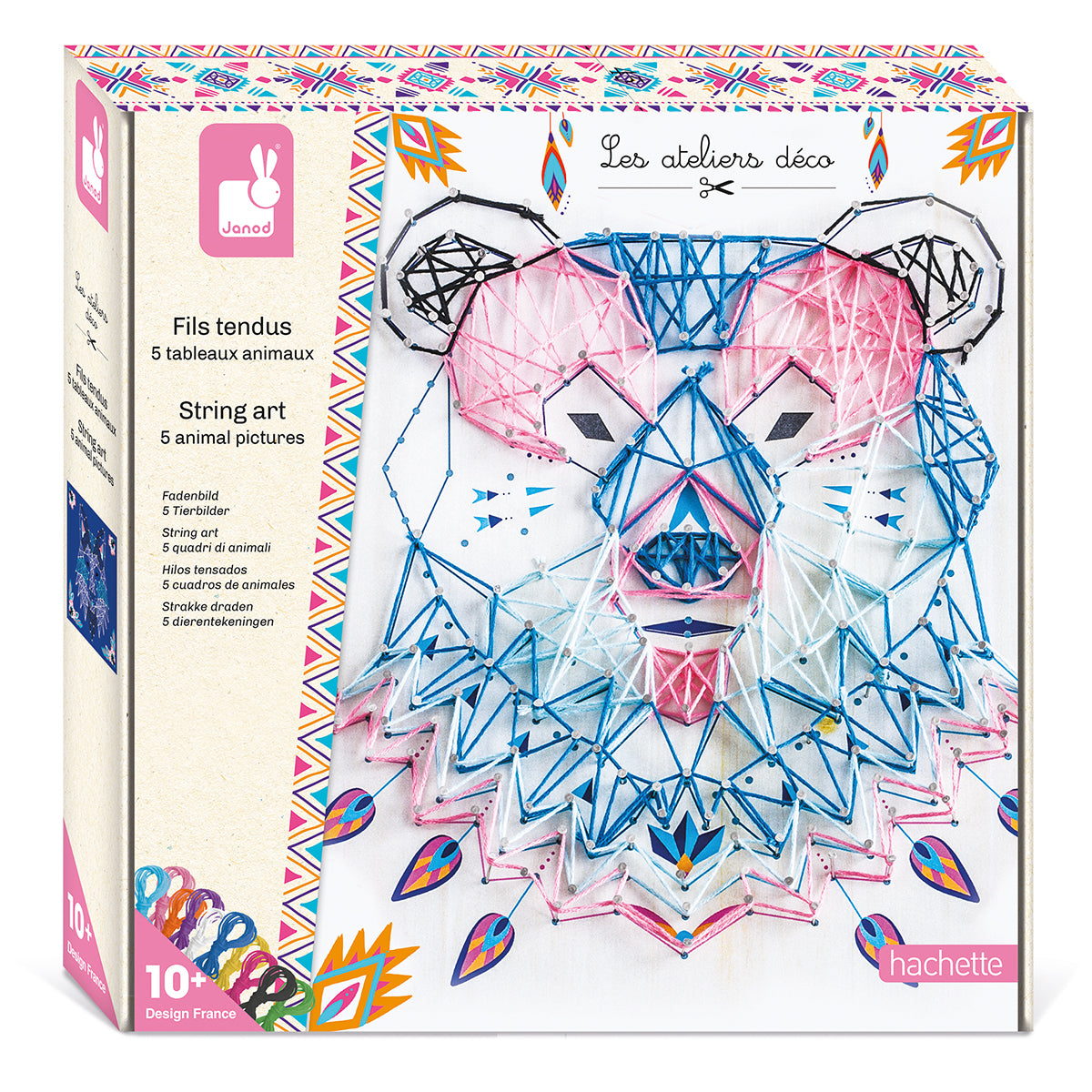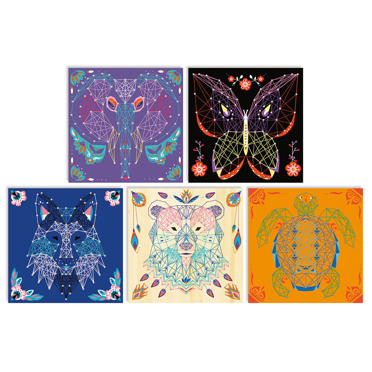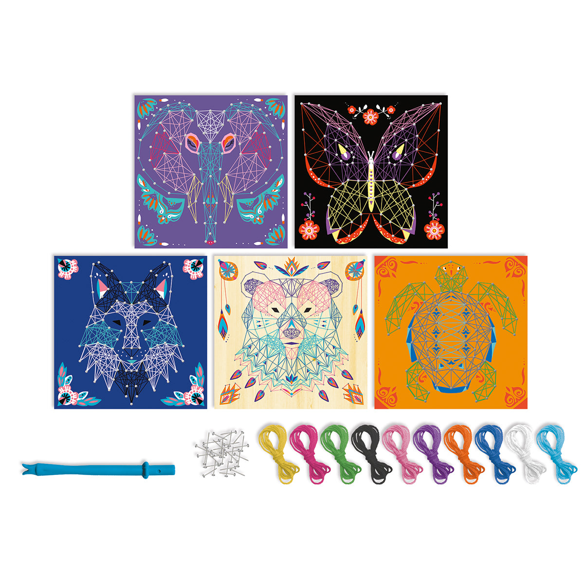 5 String-Art-Projekte mit 10 7-Meter-Strängen Baumwollfaden, 800 Nägeln und einem Nagelzieher. Enthält ein Heft mit Vorlagen und Anleitungen. Diese kreative Aktivität fördert die motorischen Fähigkeiten, das Denken und die praktische Anwendung.