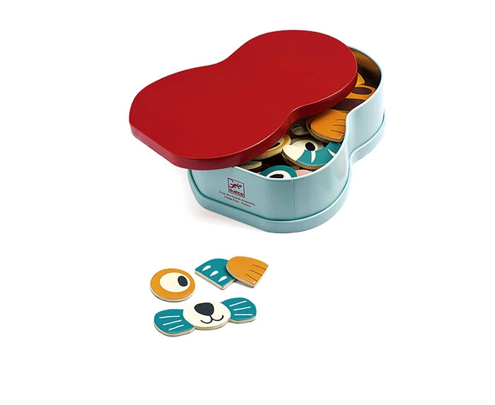 1 Metallbox in Tierform und 41 magnetische Holzteile.
