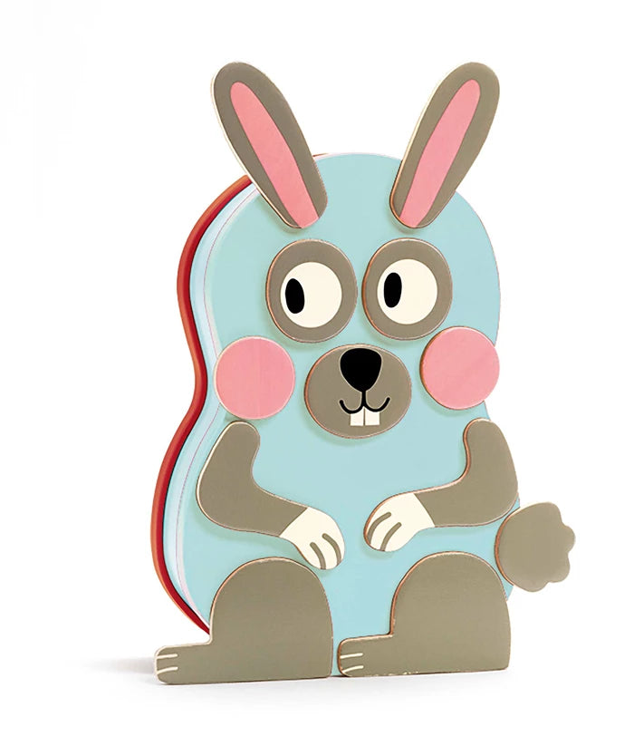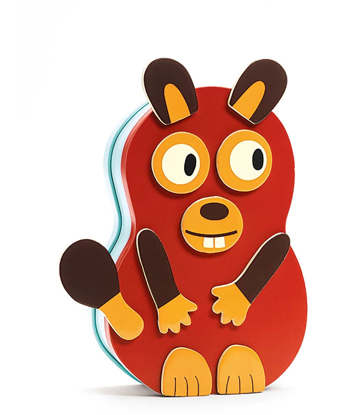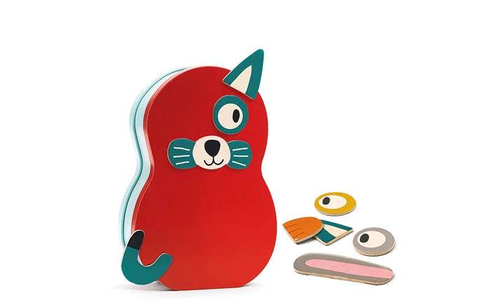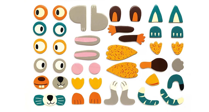 Kinder kleben die magnetischen Holzteile auf die Metallbox und haben Spaß beim Erstellen von Kaninchen, Katzen, Eulen, Bibern und mehr!