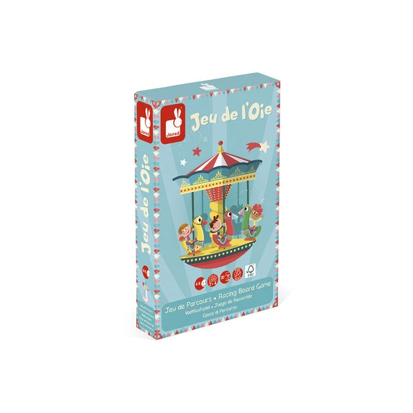 Das Gänsespiel besteht aus einem Spielbrett aus Pappe (28 x 28 cm, 1,5 mm dick), 4 Holzgänsen (3,5 x 1 x 4 cm) und zwei Holzwürfeln (2 x 2 x 2 cm).