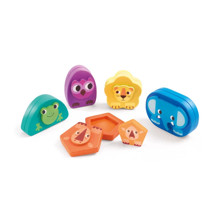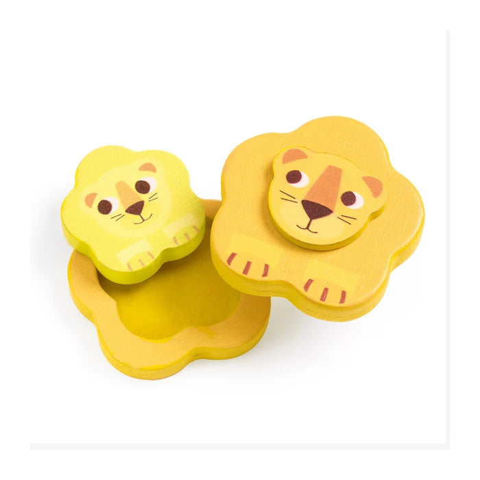 Dieses Zuordnungsspiel führt Ihr Baby mit 5 Wildtieren und ihren passenden Babys an Formen und Farben heran.