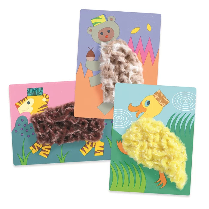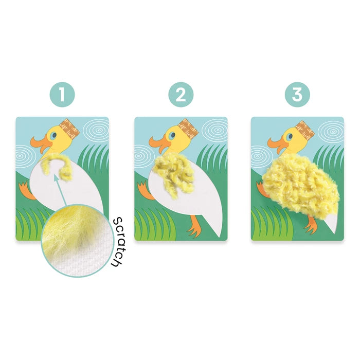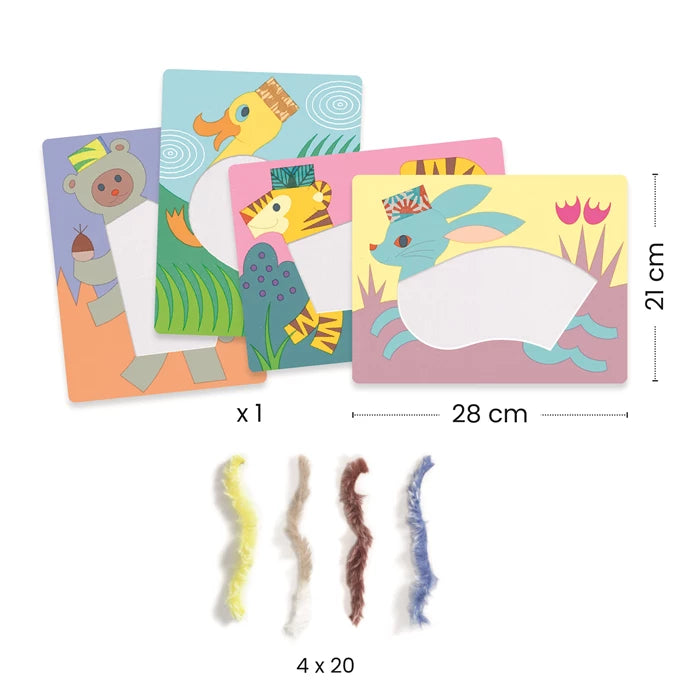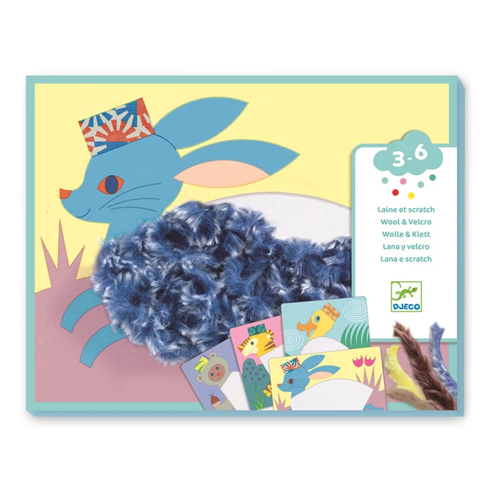 Eine sanfte Beschäftigung wie mit einem Kuscheltier! Kinder basteln niedliche Tiere aus weichen Wollfäden, die sie an Klettverschlüssen befestigen.