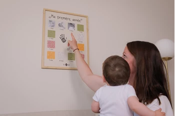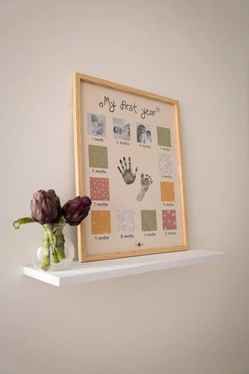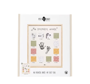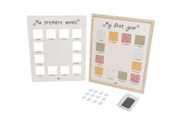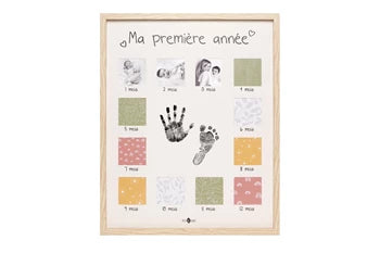 Avec des empacements pour apposer 12 photos et un espace pour réaliser 1 empreinte encre sans transfert, ce poster crée de façon originale un adorable souvenir de la première année de bébé. Ce cadre est une façon poétique et chrnonologique de conserver ces instants précieux. Il peut être posé ou accroché au mur. Son arrière fond est décoré des motifs Petit Artichaut, en attendant les photos des mois à venir.