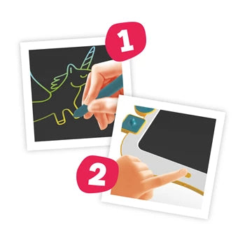 Schreiben, zeichnen und stempeln Sie endlos, ohne sich schmutzig zu machen. Drücken Sie die Taste, um zu löschen und neu zu beginnen.