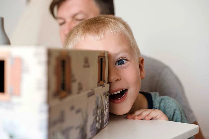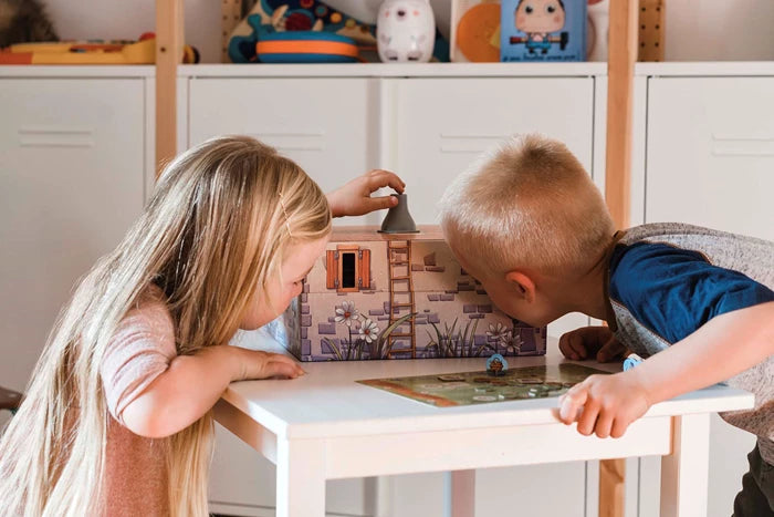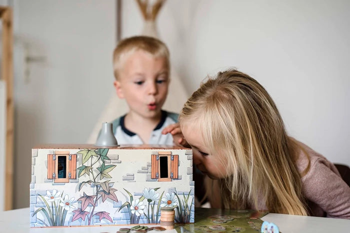 Une famille de petites souris s’est installée chez vous ! Les coquines ne se gênent pas pour vous chiper quelques objets afin de décorer leur mini-maison. En leur absence vous ne résistez pas à l’envie d’aller regarder discrètement à leur fenêtre pour en savoir plus. Où est passée ma bague ? Et la clef ? A quoi peut bien leur servir mon bouton ? Tous ensemble, les joueurs vont observer les différents recoins de la maison par les fenêtres avant que la lampe ne s’éteigne. Il faudra alors se souvenir de l’emplacement et du sens des jetons pour retrouver le maximum d’objets avant le retour des petites souris !