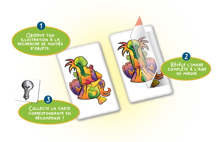 Quelles merveilles se cachent dans ces curieuses images ? Est-ce un lion assis ? Ou un lapin timide ? Ou alors les deux ? Découvrez qui vous attend de l'autre côté du miroir ! Transformez les moitiés d’image en un tout à l'aide des cartes miroirs : une ligne courbe se révèle être une aubergine, et un drôle de gribouillis est en fait un palmier géant. La première personne qui a retrouvé 10 objets gagne la partie !