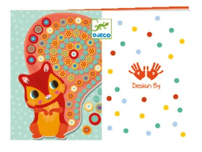 Eine Einführung in die Mosaikgestaltung mit Stickern. Kinder spielen mit Formen, Materialien und Farben und kleben kleine, bunte Sticker auf, um drei schöne Mosaikstücke zu gestalten.