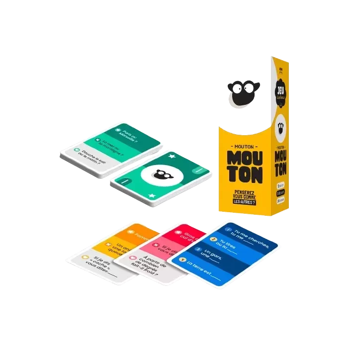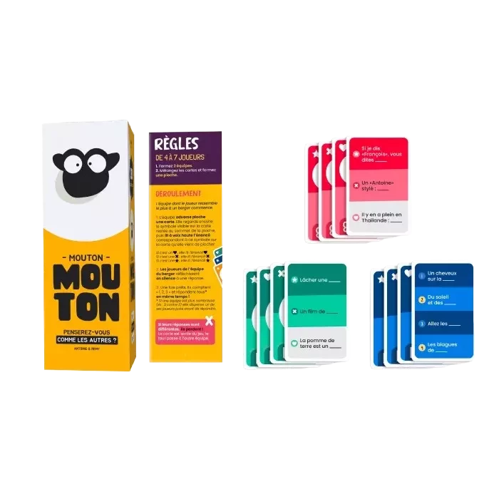 Mouton Mouton, c’est le jeu qui va mettre votre complicité à rude épreuve ! Complétez les phrases en même temps que votre partenaire : si vos réponses sont identiques, vous remportez la carte ! Enchaînez les bonnes réponses pour faire grimper votre score… mais attention : une seule erreur, et tout peut s’écrouler !