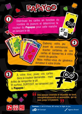 Un jeu qui a de drôles d'atouts ! Dans ce jeu de plis aux cinq couleurs, il ne faut surtout pas marquer de points ! Pour se faire, évitez de remporter des plis mais surtout de ramasser les Payoos et le maudit Papayoo, ce 7 dont la couleur est déterminée au hasard à chaque début de manche. Papayoo : une alternative vivifiante à tous les jeux de cartes traditionnels.