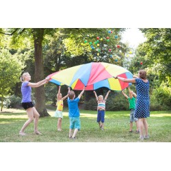 Dieses fröhliche Spiel fördert den Teamgeist und sorgt für jede Menge Spaß. Gemeinsam lenken Kinder die bunten Bälle auf den großen Fallschirm und halten ihn geschickt in Bewegung. Der robuste Stoff mit zwölf Griffen und einem Durchmesser von drei Metern sowie die mitgelieferten 24 Kunststoffbälle bieten abwechslungsreiche Spielideen, die Bewegung und Koordination stärken.