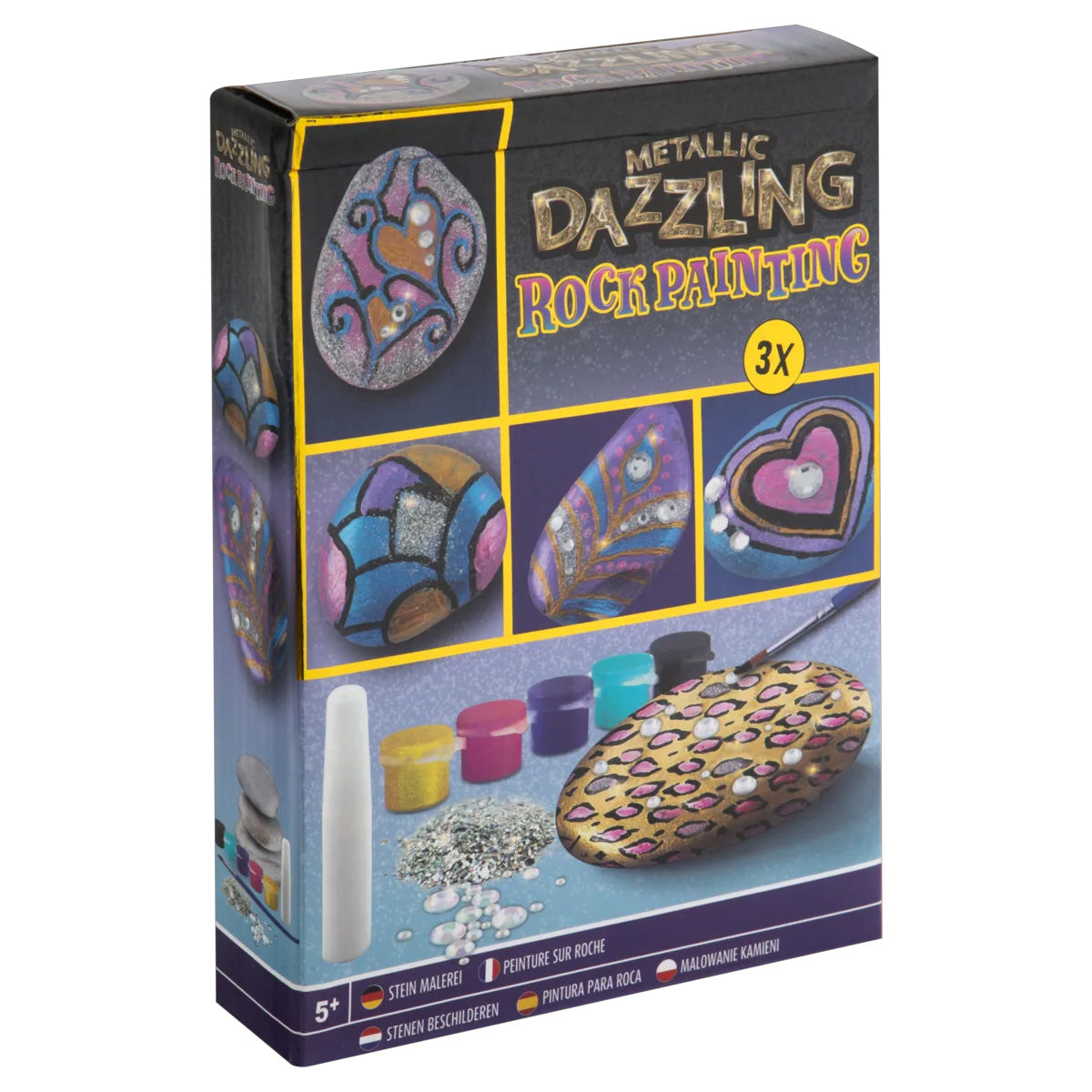 Steine bemalen mit 3 Steinen, 5 Farben, Glitzer und einem Pinsel.
