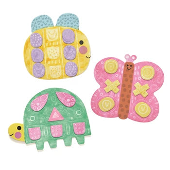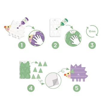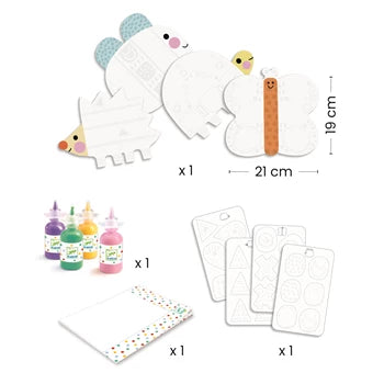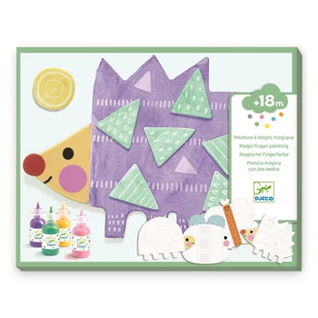 Ein paar Tropfen Farbe... und schon kann man die Tiere mit den Fingern ausmalen. Wie von Zauberhand entstehen kleine Muster! Anschließend kann Ihr Kind die Tiere mit Aufklebern bekleben und so noch schöner gestalten.