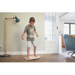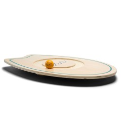 Auf dem hölzernen Balancebrett können Kinder spielerisch Gleichgewicht und Konzentration trainieren. Ziel ist es, die Bälle geschickt in die Rille zu befördern, ohne dass sie herunterfallen. Wichtig ist, dass die Bälle mit den Fischen nicht mit denen mit den Haien verwechselt werden.