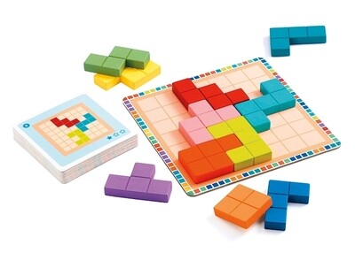 11 Holzteile zum Rekonstruieren eines perfekten Quadrats und 30 Herausforderungskarten mit vorgegebenen Startpositionen.