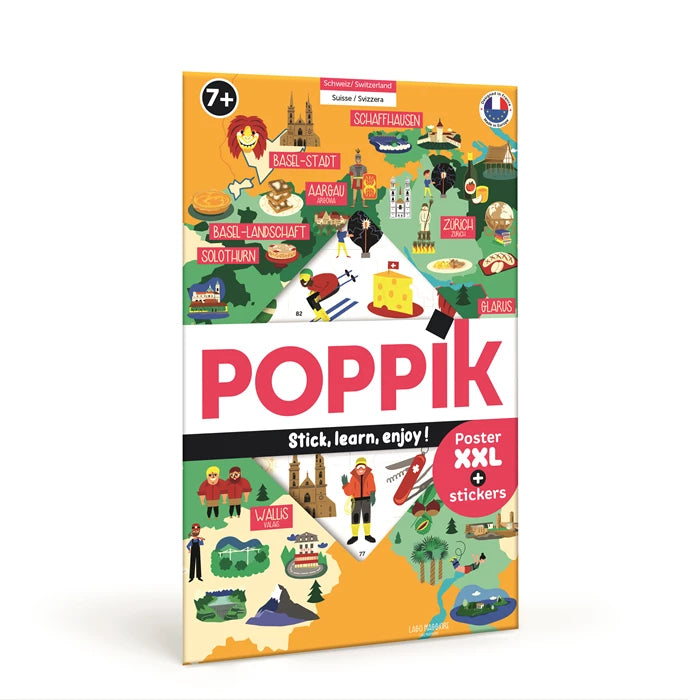 Ein Poster der Schweiz zum Vervollständigen mit repositionierbaren Aufklebern.
