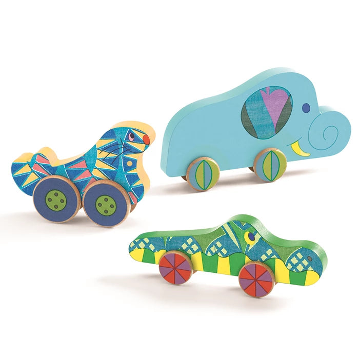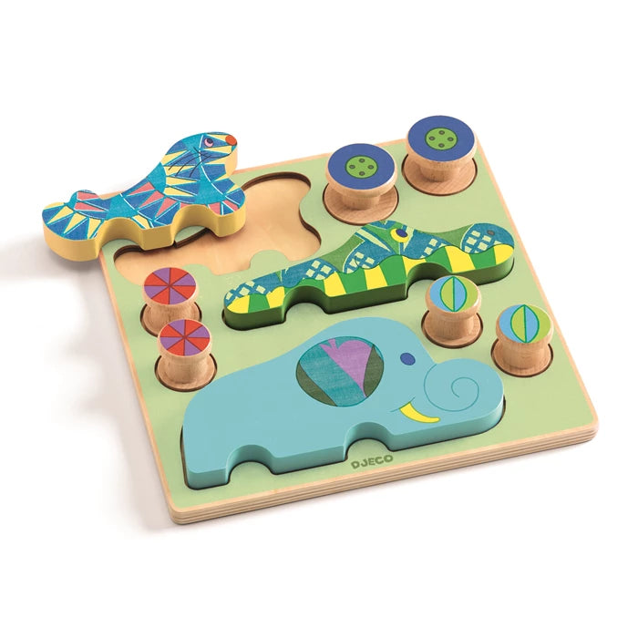 Puzz & Roll ist ein 2-in-1-Spiel: ein Holzpuzzle und ein Rollspielzeug. Kinder setzen die Räder mit dem gleichfarbigen Tier zusammen und rollen sie. Anschließend legen sie alles wieder auf die Basis und beginnen von vorne!
