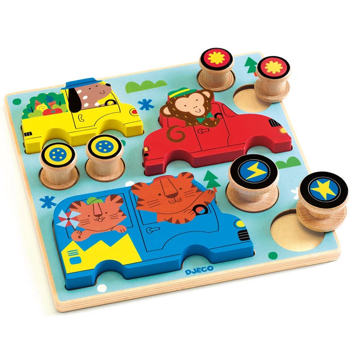 Puzz & Roll ist ein 2-in-1-Spiel: ein Holzpuzzle und ein Rollspielzeug. Kinder setzen die Räder mit dem gleichfarbigen Tier zusammen und rollen sie. Anschließend legen sie alles wieder auf die Basis und beginnen von vorne!