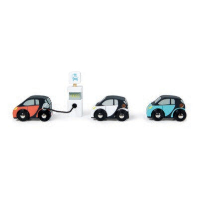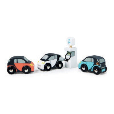 Erleben Sie die Zukunft des Transports mit diesem Set aus 3 intelligenten Elektroautos und Ladegeräten. Jedes Auto verfügt über eine kleine Öffnung zum Anschließen an eine Ladestation.