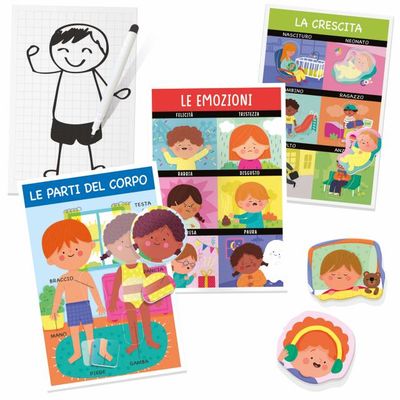 Un divertente gioco ad incastri per riconoscere la propria identità fisica ed emotiva. Il bambino scopre le parti e le posizioni del corpo, i cinque sensi, le espressioni del viso e altro ancora. In più, rappresenta il corpo umano disegnandolo.
