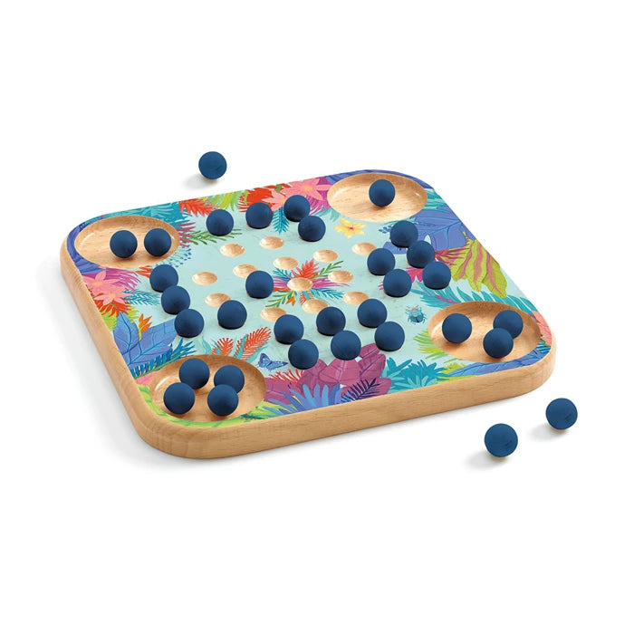 Ein traditionelles Holzspiel, bei dem am Ende nur eine Murmel auf dem Brett bleiben darf! Eine Lösung unter Hunderten von Möglichkeiten wird angeboten.