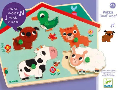 Holzpuzzle mit Geräuschen zum Thema Bauernhof. Wau, Miau, Quak-Quak, Mäh-Mäh, Muh! Kinder legen jedes Tier an seinen Platz, um seinen Laut zu entdecken.