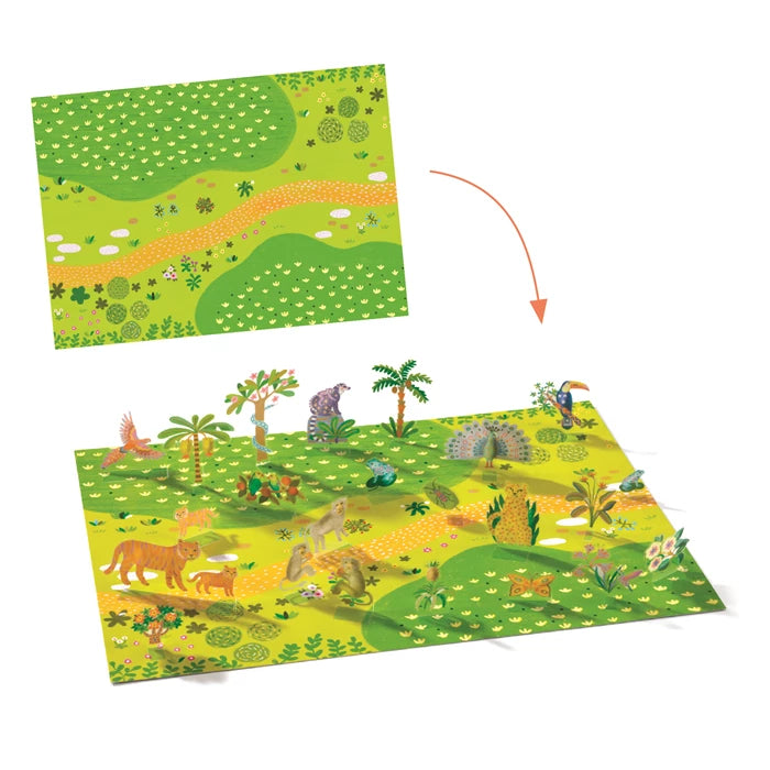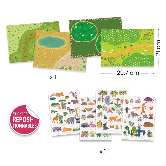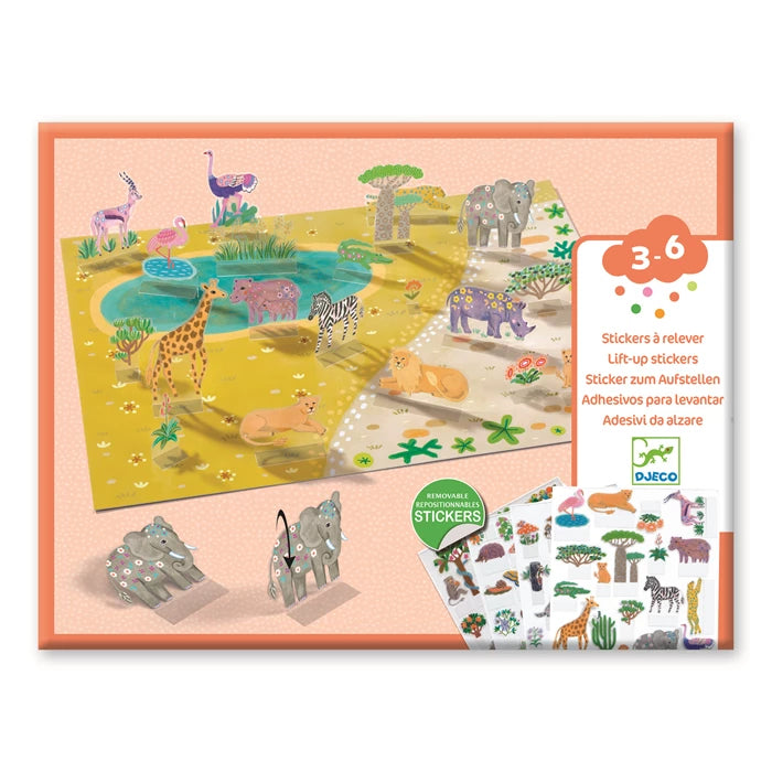 Das Kind klebt die repositionierbaren Aufkleber auf die großen Bilder und hebt sie dann einzeln hoch ... um dreidimensionale Szenen zu erstellen und endlose Geschichten zu erfinden!