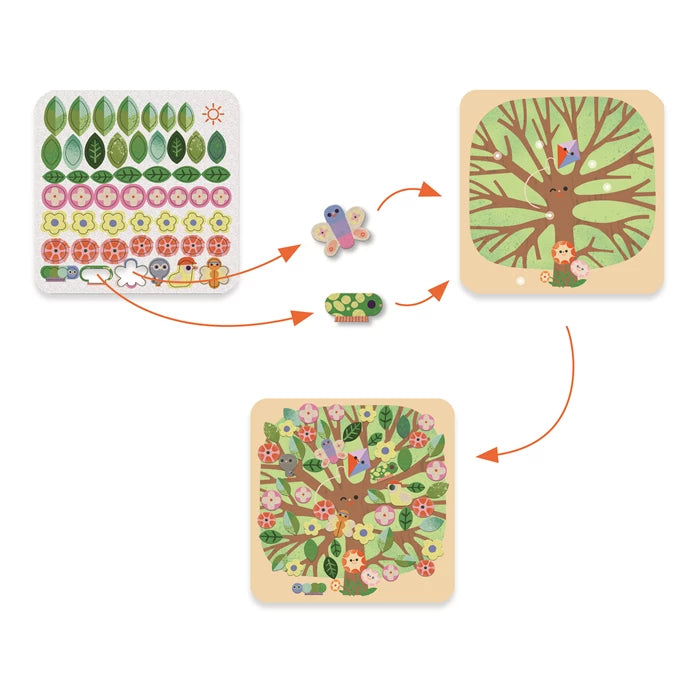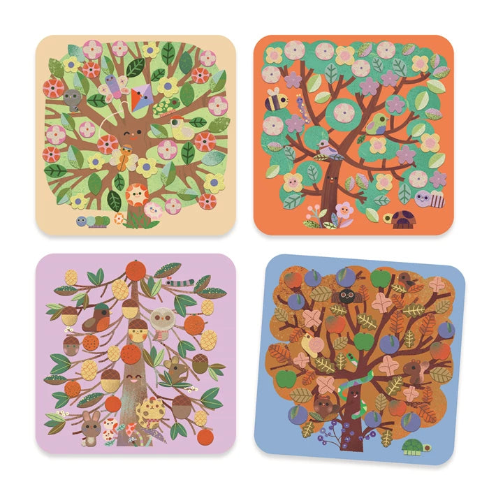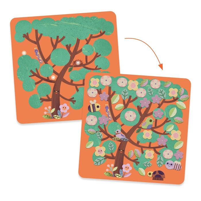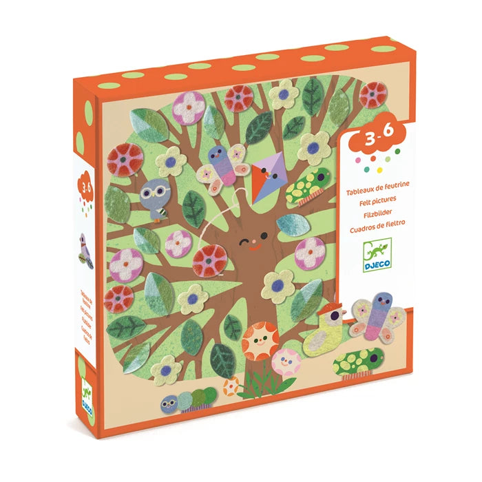 Weiche Filzcollagen für Kinder ab 18 Monaten erwecken Bäume zum Leben. Eine halb angeleitete, halb freie Aktivität, die sowohl die Feinmotorik als auch die Kreativität fördert.