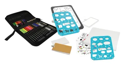 Papierformat für Comics und Mangas: A5 – 21 x 14,8 cm. Papierformat für animiertes Notizbuch: 11,4 x 6,5 cm. Umfangreiches Zubehör: 30 A5-Blätter, 100 Blätter für Daumenkino mit Clip und Umschlag, 2 Bögen Schablonen, 4 Bögen Aufkleber, 1 Tasche mit 12 klassischen Filzstiften, 12 Pinselstiften, 12 Aquarellfarbstiften, 1 Pinsel, 1 Gold-Gelstift, 1 Silber-Gelstift, 1 Feinstift, 1 Bleistift, 1 Radiergummi, 1 Lineal, 1 Anspitzer. Farbige, bebilderte Anleitung. Benötigt 4 LR03-AAA-Batterien (nicht im Lieferumfang enthalten).