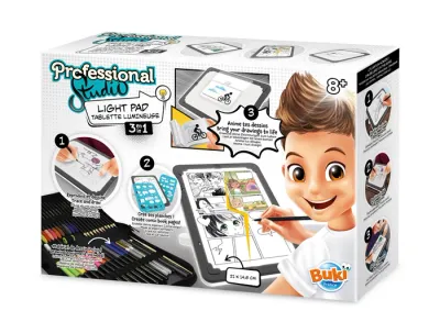 Ein tragbares Leuchttablett zum Zeichnen, Nachzeichnen, Erstellen von Comics und sogar animierten Notizbüchern! Zeichenfunktion: Legen Sie eine Vorlage und dann ein leeres Blatt (A5-Format) darauf. Verwenden Sie die LED-Beleuchtung, um die Vorlage zu kopieren oder einfach, um Ihre Kreation zu beleuchten! Comic-/Manga-Funktion: Legen Sie ein Blatt auf, verwenden Sie die Schablonen, um Ihre leeren Tafeln zu erstellen, zeichnen Sie dann, fügen Sie Aufkleber hinzu und erstellen Sie Ihre Geschichten. Daumenkino-Funktion: Setzen Sie den Adapter auf das Tablett. Das Tablett ist tragbar und kann dank der 4 Füße flach, dank des mittleren Fußes geneigt oder direkt auf den Knien verwendet werden.