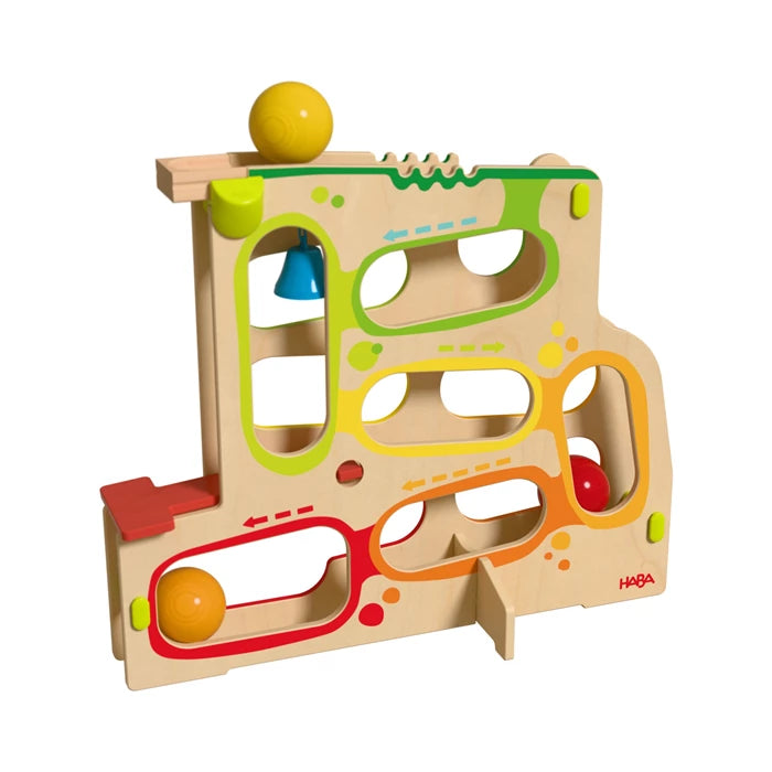 Raus aus der Verpackung, Ständer einstecken und los geht‘s mit der HABA Kugelbahn „Rund um die Ecke“. Die Kugel-Standbahn kommt bereits montiert aus der Verpackung. So können schon die kleinsten Murmel-Fans ab 1 Jahr mit den 3 mitgelieferten großen Murmeln sofort von ihrer Startposition aus losspielen. Und schwupps! Eine Murmel läutet die Glocke und ein fröhliches Bimmeln ertönt. So geht das Rennen weiter bis zum interaktiven Höhepunkt: dem Hebel. Von dort aus rollt die Murmel nur noch mit Hilfe der Kinder weiter: Heben Sie den Hebel an, um die Murmel um die letzte Kurve und die Bahn hinunter ins Ziel zu schieben! Schon gewusst? Die Kugel-Standbahn „Rund um die Ecke“ lässt sich ganz einfach mit nur einem Klick an die HABA Kullerbü-Systeme anschließen.