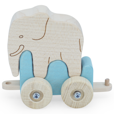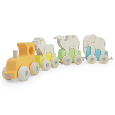 Einsteigen und Abfahrt mit der nächsten Haltestelle „Safari“. Sobald Löwe, Kamel und Elefant eingestiegen sind, fährt der Holzzug los. Nach dem Ausladen bieten die Tiere reichlich Spielmöglichkeiten.