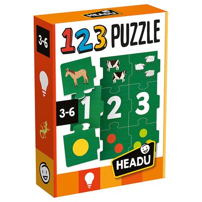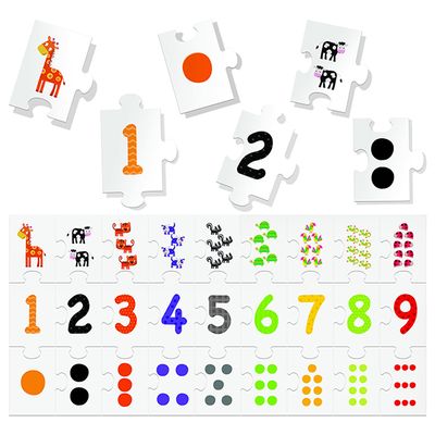 Puzzle 123 per bambini dai 3 ai 6 anni. Un grande puzzle per imparare i numeri giocando in tutte le direzioni: dall'alto verso il basso, i bambini abbinano i simboli numerici da 1 a 9 alle quantità corrispondenti e, da sinistra verso destra, dispongono i numeri e le quantità in sequenza.