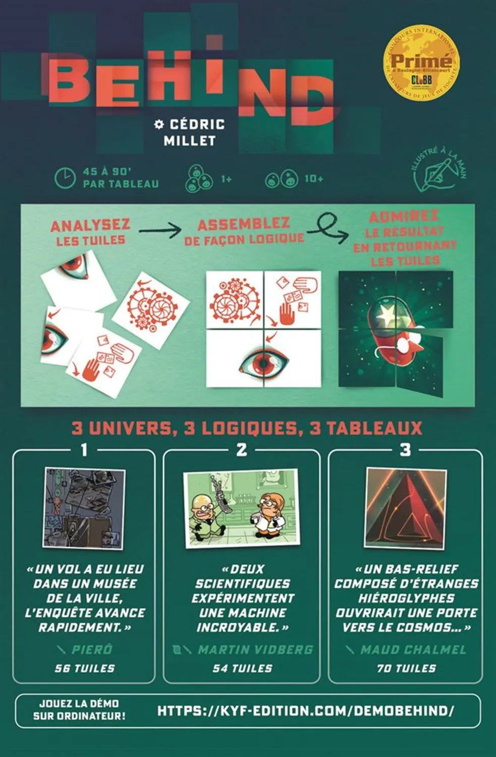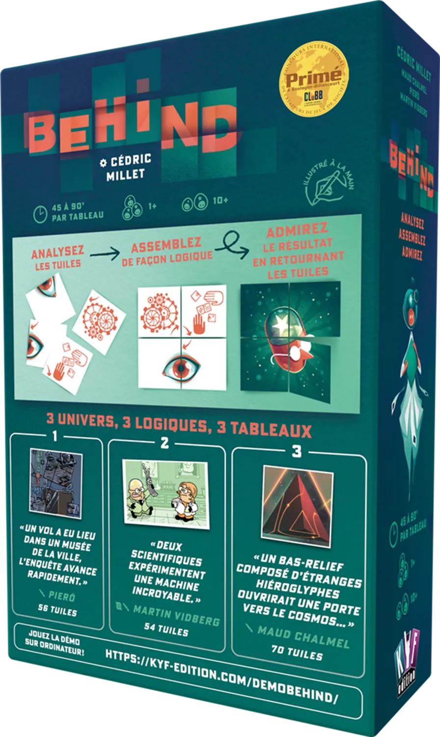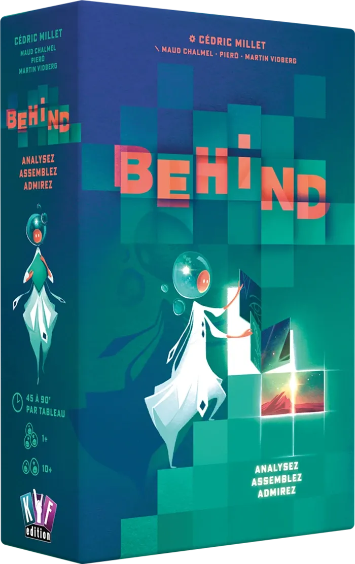 Un casse-tête coopératif diablement malin et original, c’est ainsi que l’on peut qualifier Behind. Chacun des trois tableaux de la boîte se compose de 54 à 70 tuiles qu’il convient d’assembler correctement en utilisant son sens de l’observation et sa logique. Regardez les éléments en détail, faites le lien entre les phrases et les mots, et composez ce qui vous semble être le tableau complet et en ordre. Si vous avez des difficultés, utilisez les cartes Indice. Ensuite, retournez toutes les tuiles. Si ce faisant vous obtenez une superbe image sans défaut, vous avez accompli votre mission !