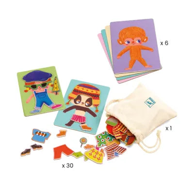 Il bambino sceglie un capo di abbigliamento dal sacchetto e lo posiziona sul tabellone. Qualunque sia l'abbigliamento e la stagione, dovete essere il primo giocatore a vestire completamente il vostro personaggio con cappello, top e slip. Vestiti originali in colori vivaci per combinazioni divertenti... i vestiti dei vostri personaggi saranno a volte molto originali!