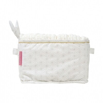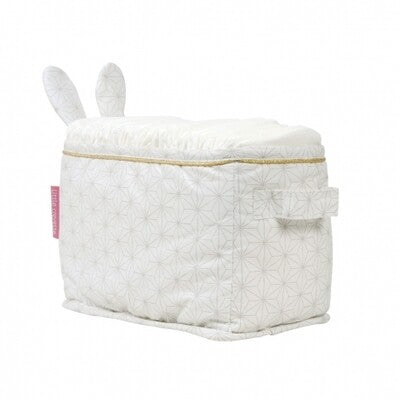 Ideale per organizzare la zona fasciatoio, questo contenitore diventa anche un elemento decorativo con le sue divertenti orecchie da coniglietto e la sua bella stampa geometrica in cotone biologico*.