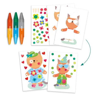 La confezione contiene Collage: 1 cartoncino illustrato (21 x 28 cm), 2 fogli di cartone spesso pretagliati, 6 pon-pon, 2 occhi mobili, 1 tubetto di colla. Colorazione: 2 schede illustrate (21 x 28 cm), 1 foglio di adesivi, 3 pastelli a cera bifacciali (6 colori). Ritagli: 4 fogli illustrati (21 x 28 cm), 1 paio di forbici di sicurezza, 8 occhi mobili. Mosaici: 2 fogli di sagome spesse (21 x 28 cm), 3 fogli di adesivi per mosaico in schiuma metallica. Decalcomanie: 1 grande cartoncino illustrato (28 x 63 cm), 2 fogli di decalcomanie. Totem: 3 fogli illustrati pretagliati in cartone spesso, 1 foglio di adesivi (21 x 28 cm).