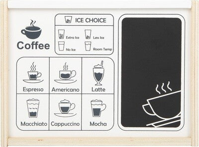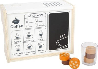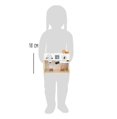 Attenzione piccoli baristi! Con questa ingegnosa macchina da caffè in legno per professionisti, verrà realizzato senz'altro un ottimo caffè nella cucina dei bambini. Due manopole girevoli con un suono di clic e un porta-filtro mobile, che trasporta il "caffè" nei bicchieri trasparenti da caffè quando viene premuto, permettono un divertimento realistico. È anche possibile preparare diverse specialità di caffè! Sul retro è presente una lavagna su cui poter scrivere e un'illustrazione dei diversi tipi di caffè.