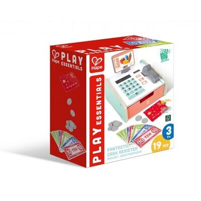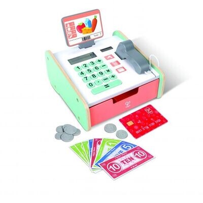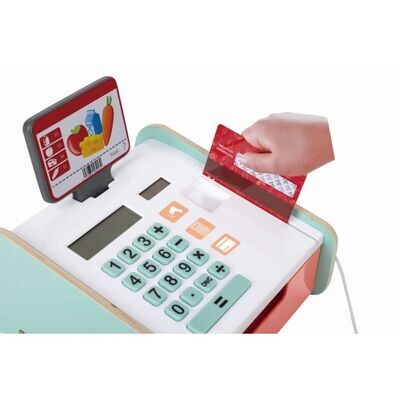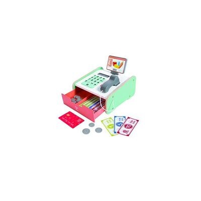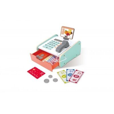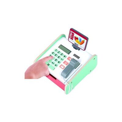 Il set contiene un registratore di cassa, una carta bancaria, nove monete e nove banconote.