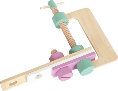 Il set è costituito da martello, chiave a bocca, cacciavite, chiave giratubi, viti, madreviti, piastre forate, chiodi e dadi. Con il morsetto grande si possono fissare i pezzi semilavorati prima del montaggio. Sperimentando e costruendo si allenano la creatività e le abilità motorie e si promuove il gioco di ruolo attivo.