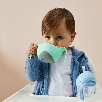 La ciotola è la misura ideale per i bambini a partire dai 6 mesi. L'inserto per la merenda trasforma la ciotola in un supporto per la merenda con il pollice e il coperchio la sigilla in posizione. La ciotola a forma di goccia si trasforma in una grande tazza. Maniglie di facile presa e base antiscivolo per un miglior controllo e stabilità. Lavabile in lavastoviglie e a microonde. Privo di BPA, ftalati e PVC.