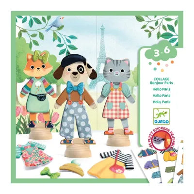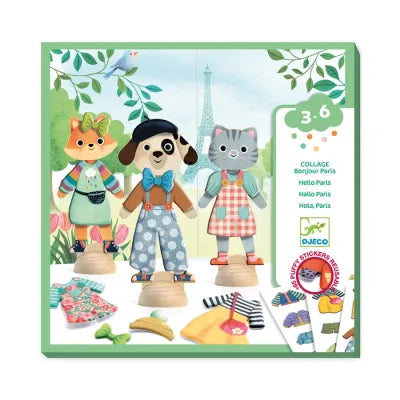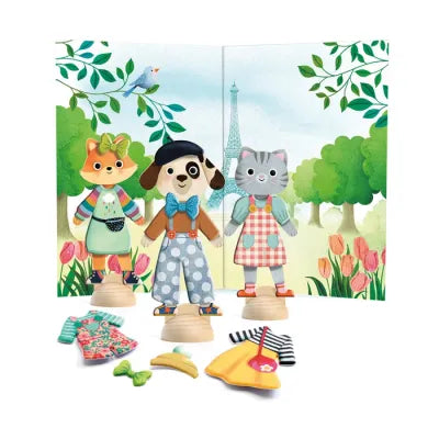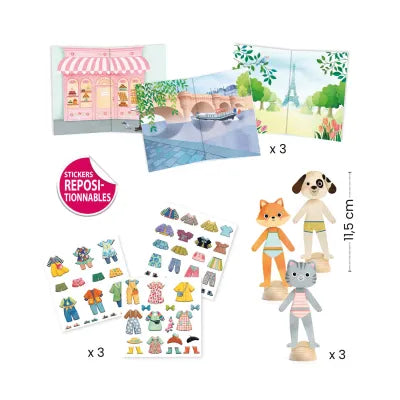 3 adorabili animali di legno e tantissimi abiti adesivi spessi da incollare e reincollare a piacere. Gli scenari e le basi dono all'interno della confezione.