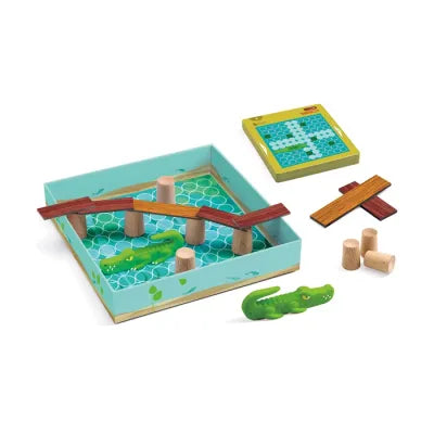 Contiene: 1 tabellone, 2 coccodrilli, 10 tronchi, 7 passerelle e 30 carte sfida.
